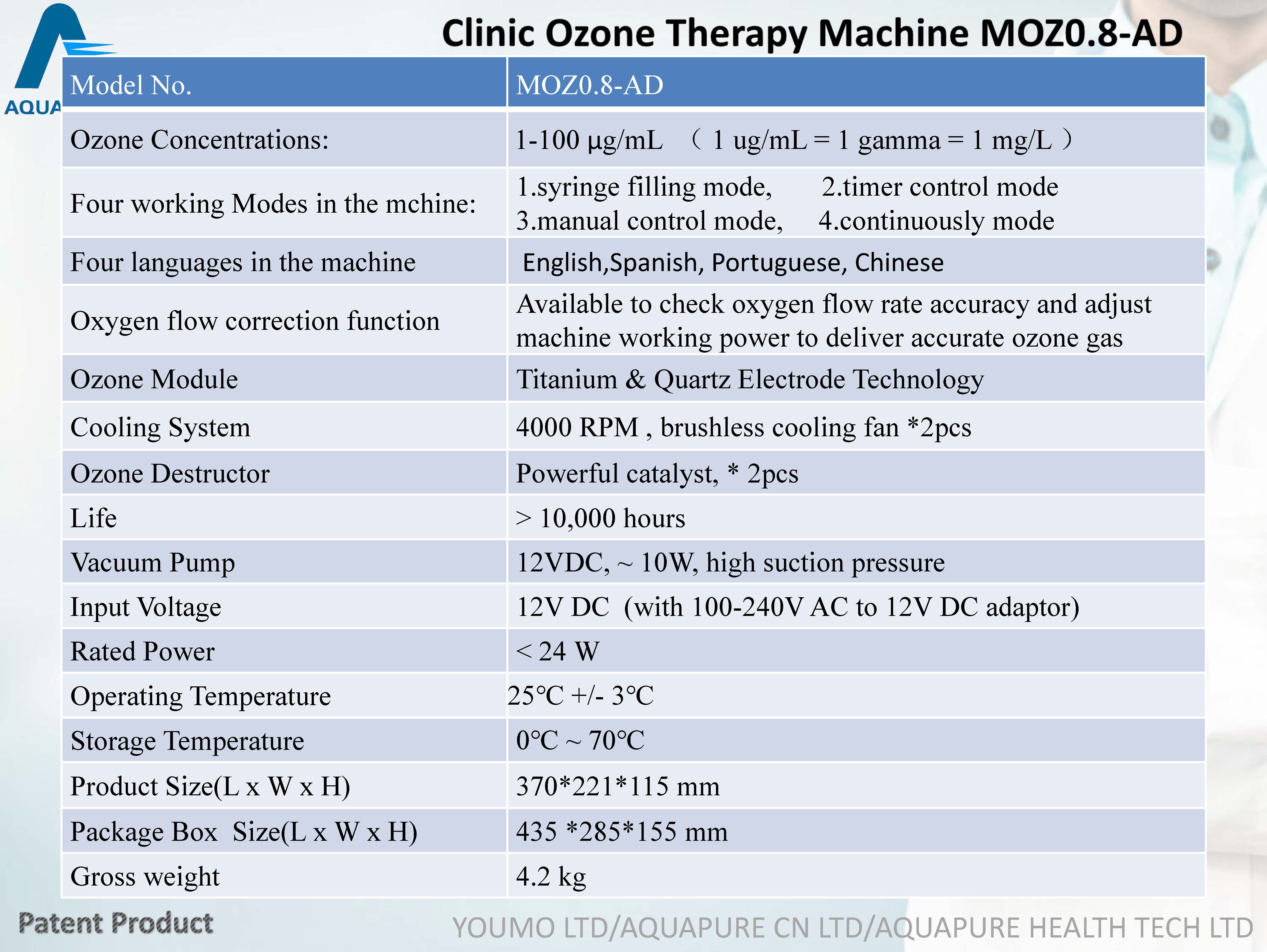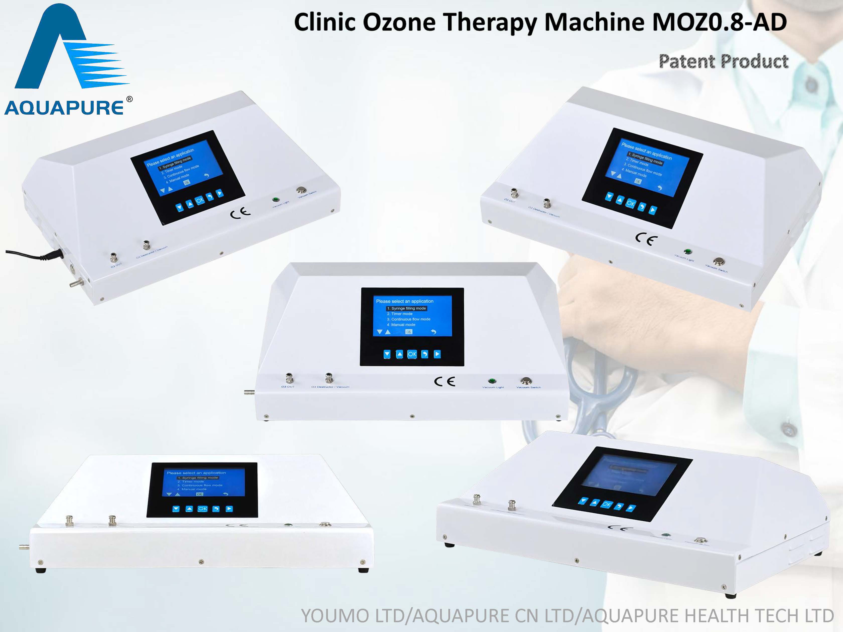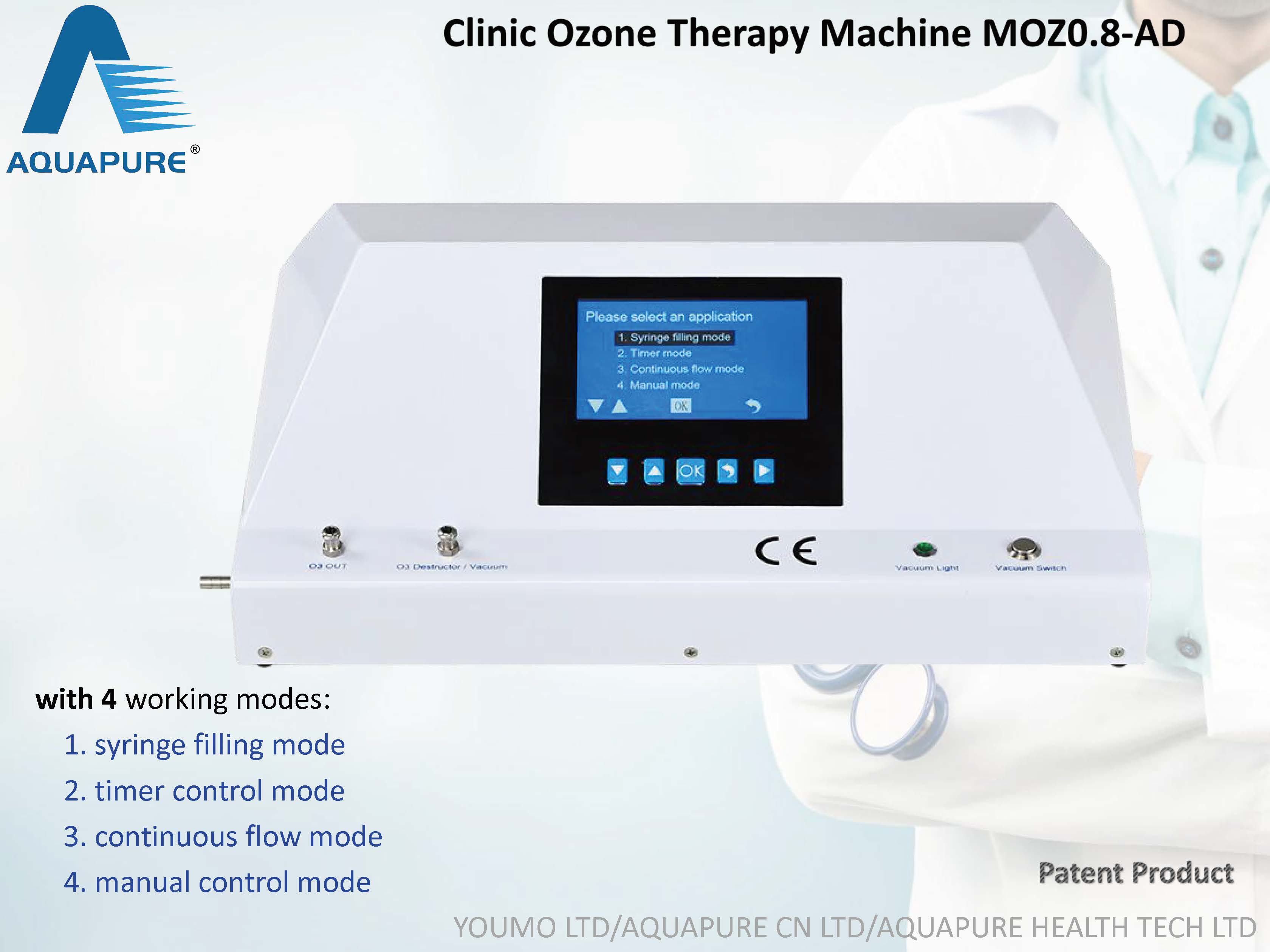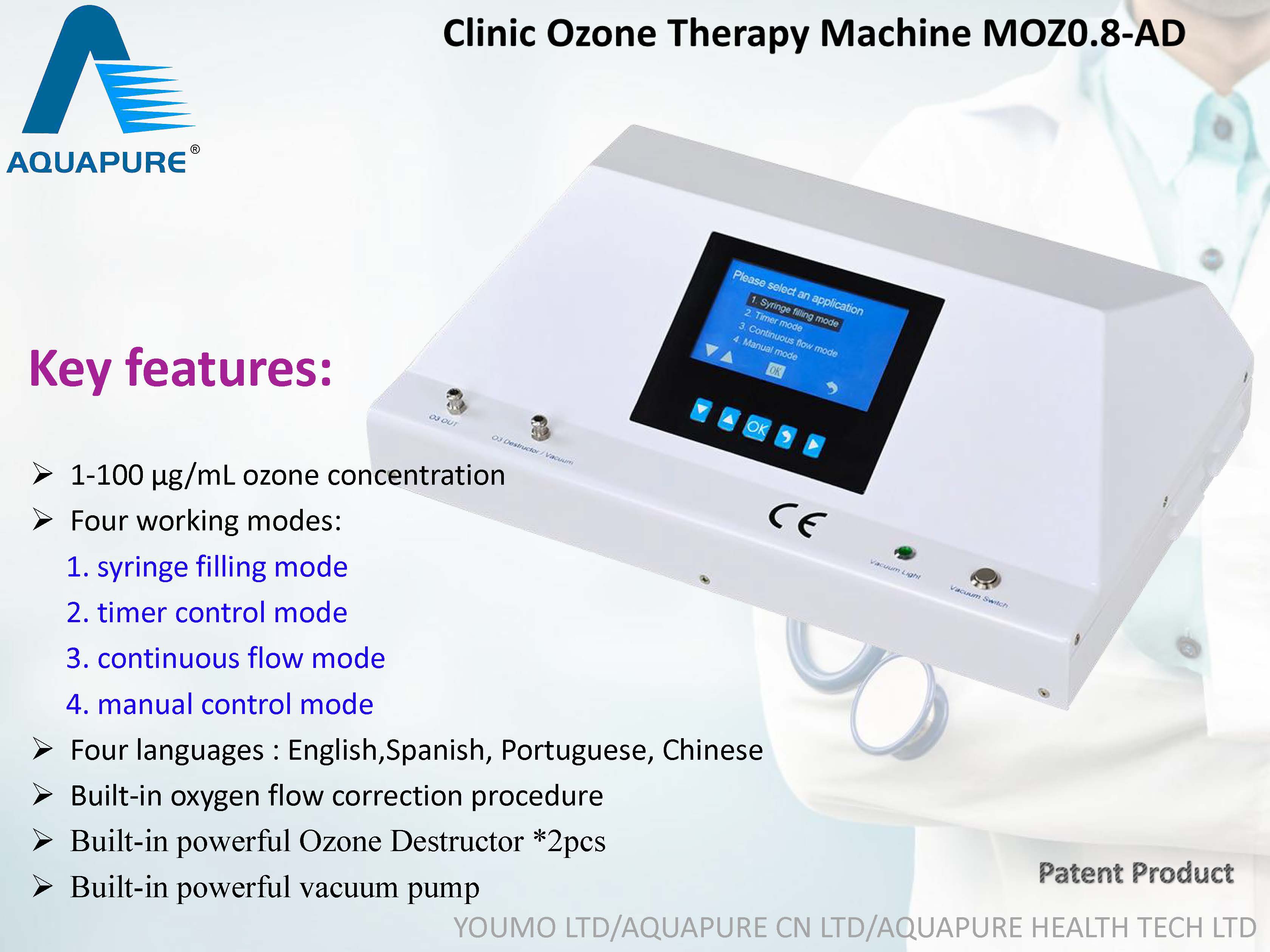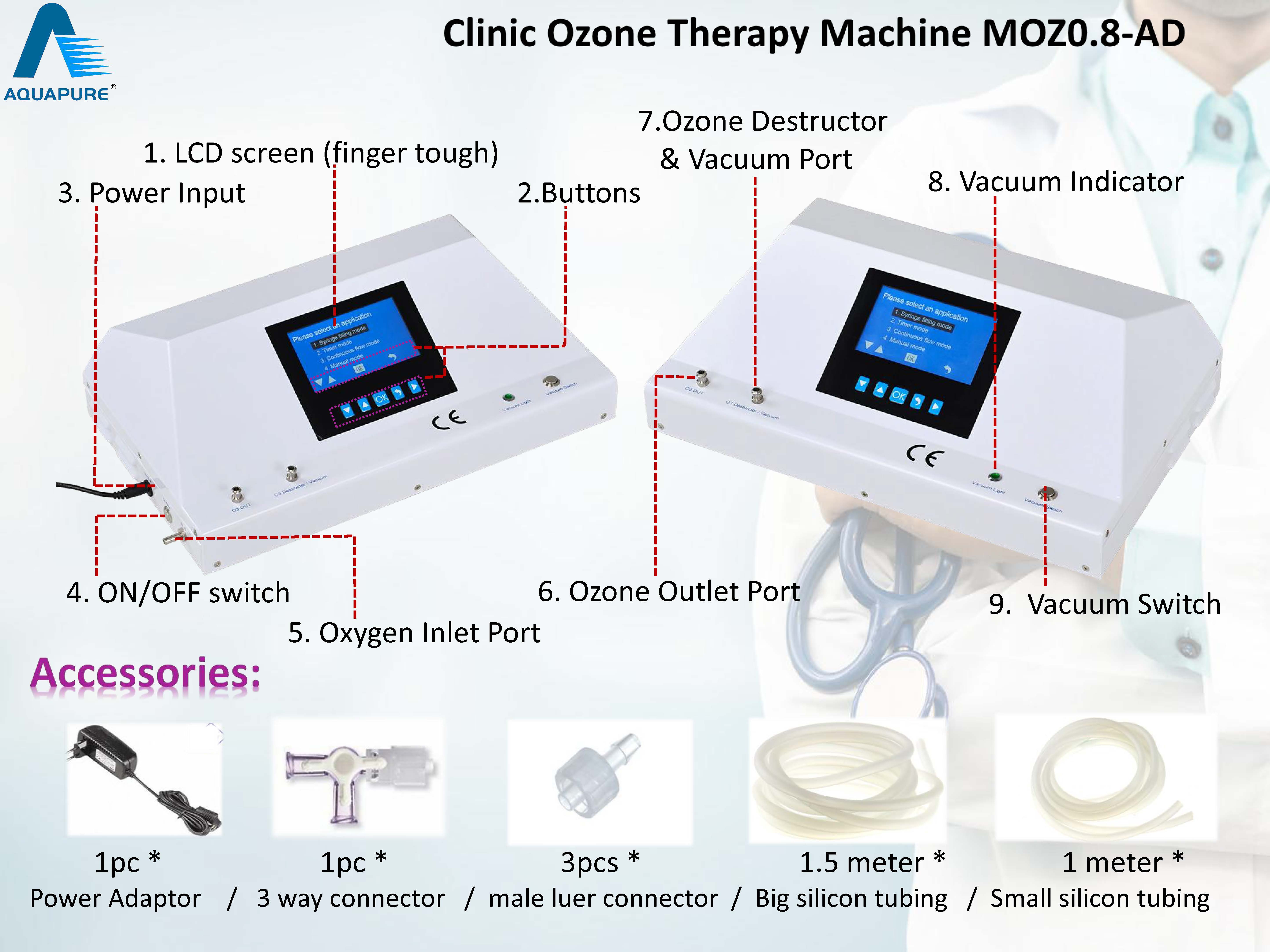 Product Description The model MOZ0.8-AD is a new medical grade ozone generator that designed for multi-treatments with four working modes. These workings modes are super convenient for users to do different therapy applications. It uses the 99.9% pure Quartz and Titanium electrodes to make pure oxygen/ozone mixed gas. The advanced computer chips and sensors are used to monitor oxygen flow and guarantee accurate ozone concentration outputs. It can deliver pure ozone from low to high concentrations (1 ~ 100 µg/mL) , and it has been built-in both the powerful ozone destructors and the strong vacuum pump inside.
