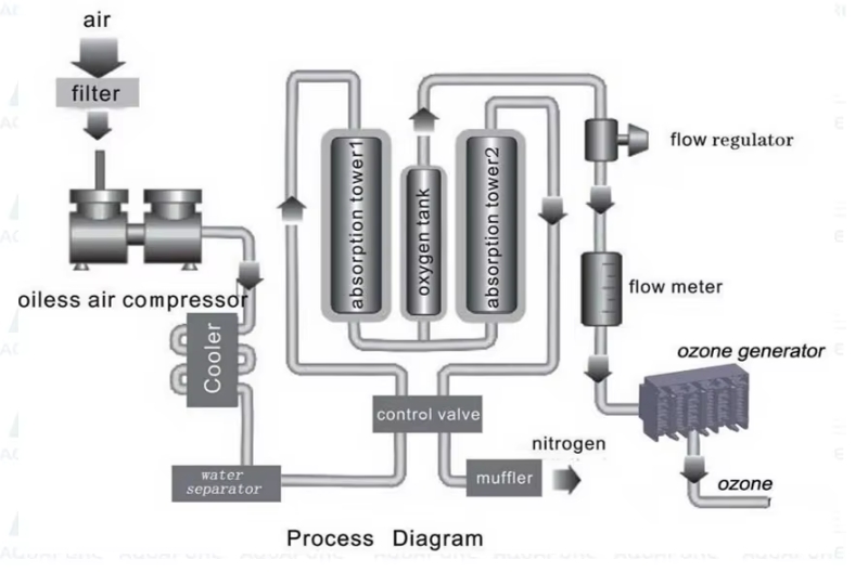 filter---air compressor -oxygen sieve beds - ozone module ---ozone output